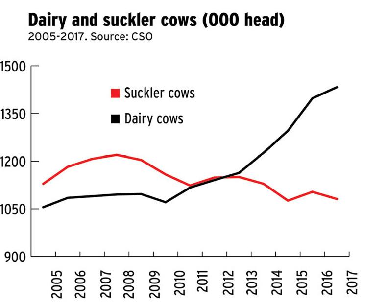 The number of suckler cows in Ireland fell by almost 23,000hd between 2016 and 2017, while the number of dairy cows jumped by almost 35,000hd.