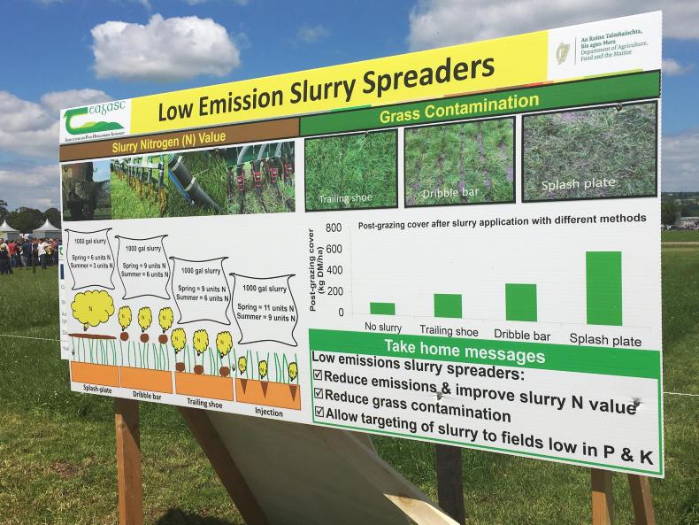 Farmers at the Moorepark 2019 open day on Wednesday were shown how to use best practice in slurry spreading to reduce greenhouse gas emissions (GHG). One method of doing so was slurry management – in particular, how we apply it.