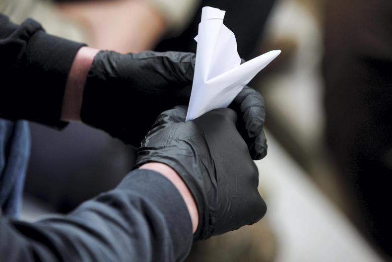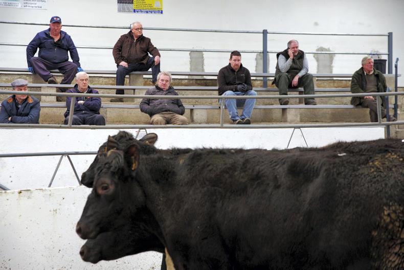 Buyers keep their distance during the cattle sale at the Cork Mart's sale in Cahir, Co Tipperary, on Wednesday, where the ring was restricted to buyers only and one seller at a time. Despite disruption, trade remains steady. \ Donal O'Leary