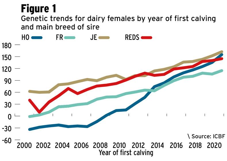 Figure 1 shows the average EBI of all first-lactation cows in the year they enter the herd for each breed.