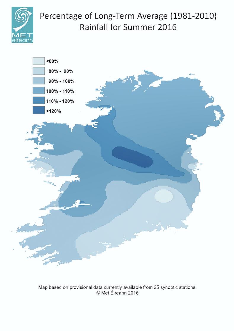 Figures over the summer months, from Met Éireann, show that June, July and August were mild and dull nearly everywhere, and slightly wet in places. Rainfall data shows a clear concentration of rain in the midlands this summer when compared to the long term average (LTA) over the years 1981 to 2010. The south and southeast have experienced a notably drier summer, less than 80% of the LTA, while the north has been wetter than normal.