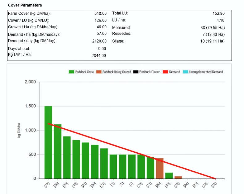Average farm cover is 518kg/DM/ha, while average cover per cow is 128kg/DM/ha. Demand has dropped back to 57kg/ha, with reseeded paddocks coming back into the rotation.