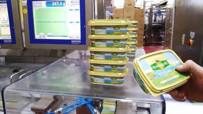 Butter arrives from Ireland in 25kg blocks. It is unpacked and reworked to create products to suit the German market. There are five packing lines for fresh butter, four for tubbed butter and one for 10g/15g frozen butter shapes that can vary from golf balls to flowers.