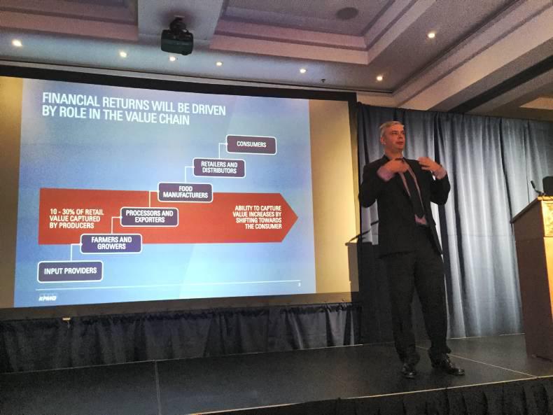 Ian Proudfoot, global head of agribusiness with KPMG, is now presenting. He says in the food supply chain, everything comes from the consumer and goes back to the consumer. KPMG analysis shows that only 10-30% of retail value typically goes back to the producers.