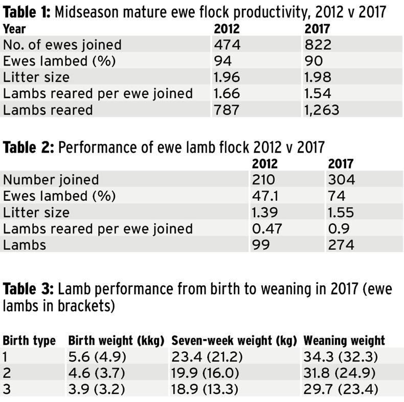 When Brian joined the programme in 2012, he was lambing just over 470 ewes and reared 787 lambs. Five years on, he lambs 822 mature ewes and has also witnessed a doubling in productivity from his ewe lamb flock, which totalled 304 head joined to the ram in 2016.