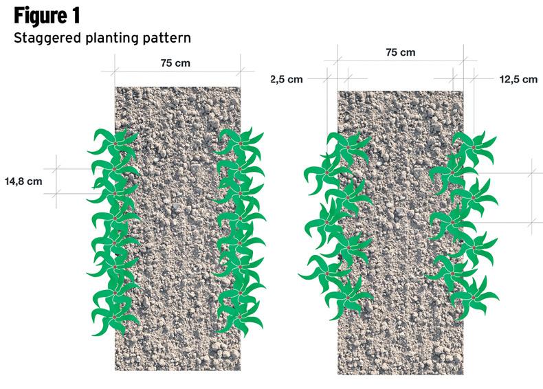Figure 1 shows the staggered planting pattern. Pöttinger says output is increased also, with single-row maize planting, forward speed is limited to about 8km/h, but with work shared between twice as many singulation units, forward speeds of the Duplex system are up to 12km/h. This method of sowing has enabled maize silage yield increases of 11%, the company claims.