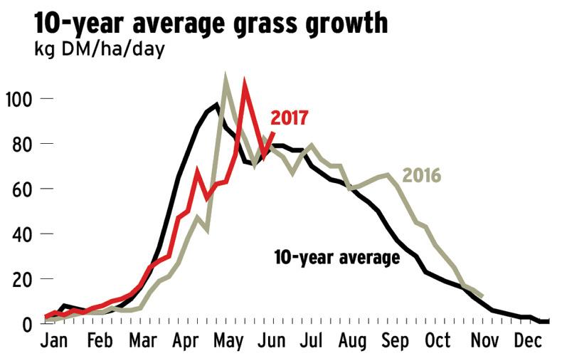 Average grass growth for this week is 85kg per day.Heat and sunshine, combined with long daylight hours are driving on grass growth.Try and get surplus paddocks cut before the weather changes.Set demand at around 70kg/ha/day and set average farm cover at around 150 to 180kg/cow.