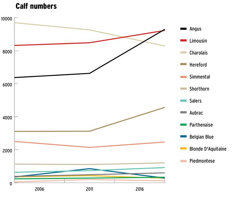 While this all looks positive for the traditional breeds, one has to wonder are they growing too fast for the demand that’s out there? The majority of 2016 calves will be sold in 2017 but with over 4,000 extra Angus and Hereford calf births compared with five years ago, is there a market for them?