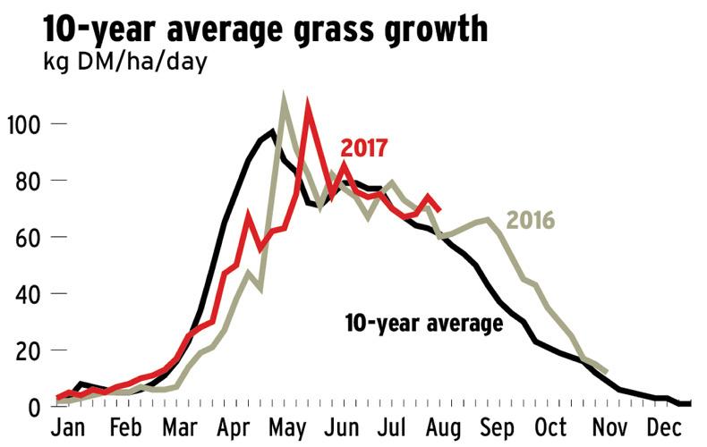 On a farm stocked at 2LU/ha, there should be 18 grazing days ahead of cattle at this point. This translates into an average farm cover of 650kg DM/ha. At 2.5 LU, this figure rises to 810kg DM/ha. By mid-September, we should be targeting 25-30 days’ worth of grass on our farms – 975kg DM/ha on the 2LU/ha farm and 1,200kg DM/ha at 2.5LU/ha. Grass will not be as inclined to head out from here on in and growth will likely slow week on week, so it is OK to carry slightly more than these targets and to front-load the increase in supply if possible.