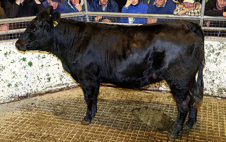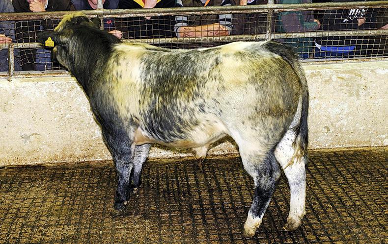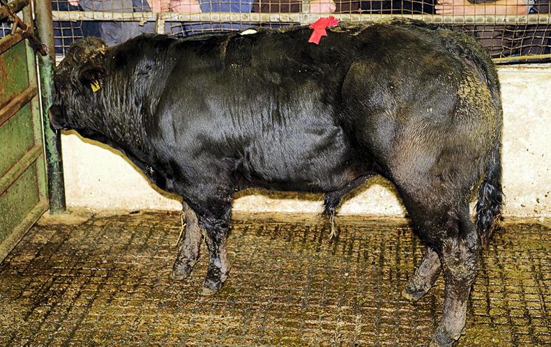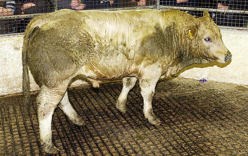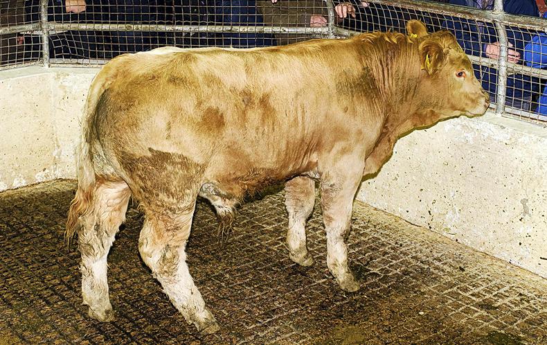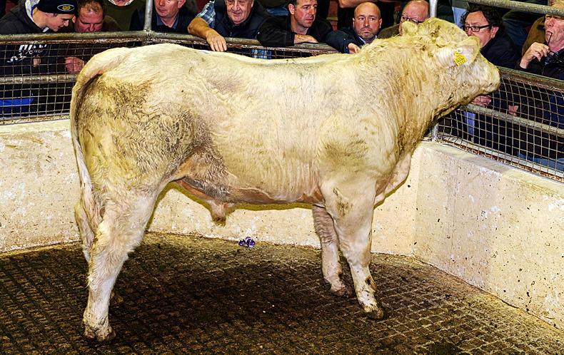 Top-quality heavy U grading bulls weighing 500kg to 570kg sold from €1.35/kg to as high as €2.55/kg, with demand for heavy bulls reflected in the 600kg Charolais bull pictured selling for €2.45/kg.