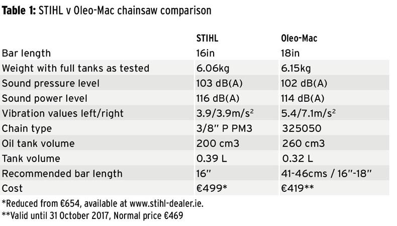 The STIHL appeared to have the edge over the Oleo-Mac but this was fitted with a longer 18in bar compared with the 16in on the STIHL.
