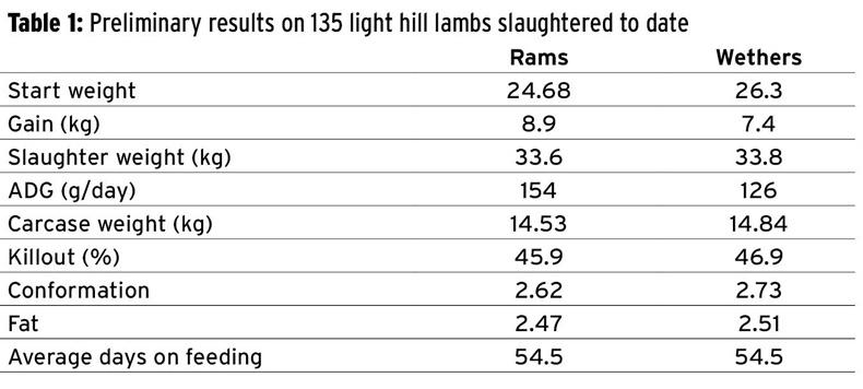 Lambs were built up to ad lib concentrates once housed and slaughtered after 54.5 days. Wether lambs started at a slightly higher weight and achieved a higher killout, which compensated for a lower daily performance in the region of 30g/day.