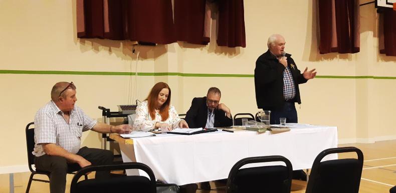 John Moran speaking at the INHFA meeting in Foilmore, Co Kerry. Seated left to right: Gerry Loftus INHFA forestry spokesperson; Mary Rooney chair of Leitrim/west Cavan; and Colm O'Donnell, national president of INHFA.