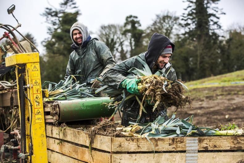 Petrut Lupu, Mihai Miron and Robert Mitran of Kilmore Farm Produce Ltd harvesting leeks in Stephenstown, Co Louth. The crop was planted in July, but with weather about to take a turn, they are eager to get the crop harvested now as ground conditions are very soft. \ Philip Doyle