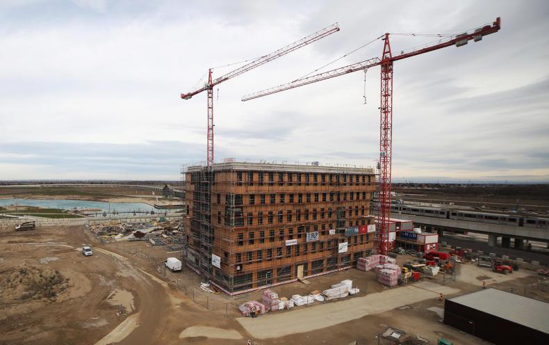 The building under construction. Preliminary research carried out by NUI Galway shows that engineered Sitka spruce cross-laminated timber (CLT) could offer similar benefits in multi-storey construction in Ireland. \ RLP