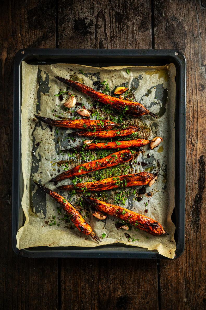 3 Remove the carrots from the oven and scatter over the unpeeled garlic, tossing until evenly combined.