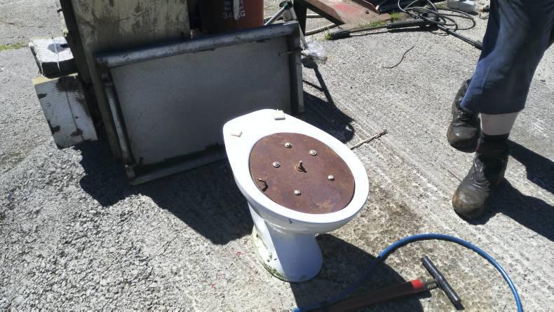 To prevent water coming up your toilet during heavy floods Frank created a lid to fit on top of the toilet. A bar underneath this lid locks under the toilet rim keeping it in place. An air tube fitted around the edges of the lid is then pumped with air sealing any possible crevice where water may leak.