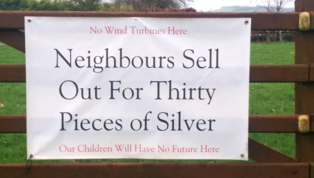 Signs read: “House prices in this area SLASHED by 50% all thanks to greedy landowners, our so-called neighbours.” Another sign reads: “No wind turbine here. Neighbours sell out for thirty pieces of silver. Our children will have no future here.”