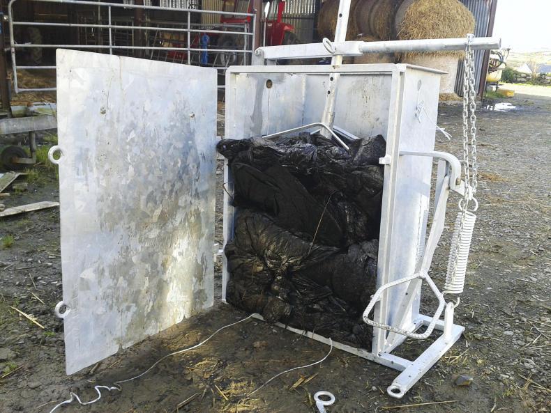 “Some farmers only put in 20 wraps to make it easier for moving,” he explained. The baler is operated via a spring-loaded device which is controlled by a foot pedal. “Baling twine is put in position first in the basket, the wrap is then loaded into the basket and the forcing plate is positioned on top of the load. When loaded to the desired level the foot pedal is pushed down, this extends the spring, when the pedal is released again the spring contracts and pulls the chain connected to the lever bar which, in turn, drives down the forcing plate and packs the plastic,” Edward explained. The silage wrap baler costs €650, it can also be used for baling silage netting.