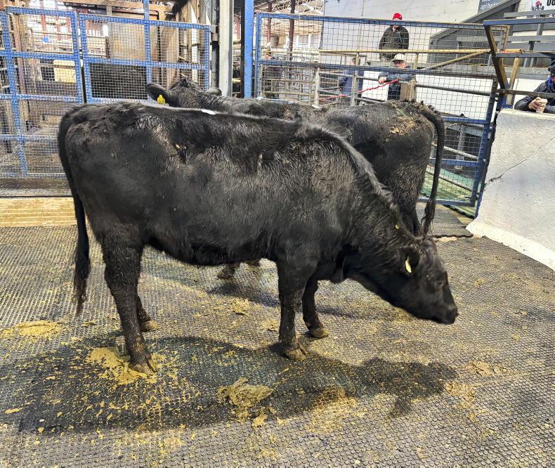 This pair of Angus-cross heifers born March 2023 and weighing 437kg sold for €1,740 (€3.98/kg).