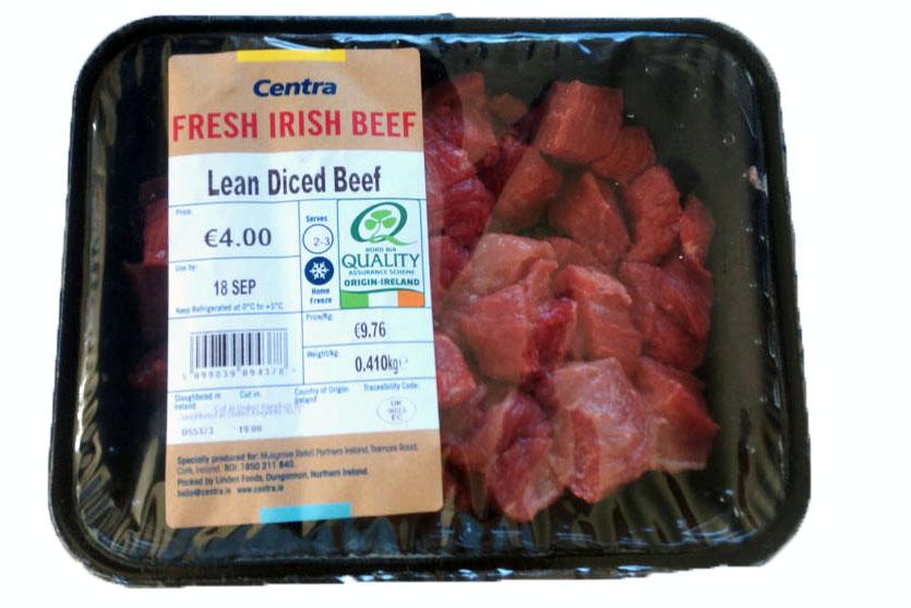 A pack of Centra diced beef, bought in Limerick on Sunday by farmer Sean O’Connell carried a label with both “Slaughtered in Ireland” and “Slaughtered in United Kingdom” on it. It also had the Bord Bia Origin Ireland logo.