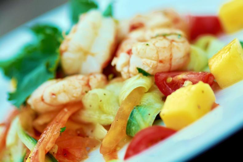 My dish in Vancouver ties in with the many Asian influences of the city. Add mango and papaya: you can use green papaya or an unripened papaya, more regularly available in Ireland. All in all, either will make a deliciously vibrant tropical salad.