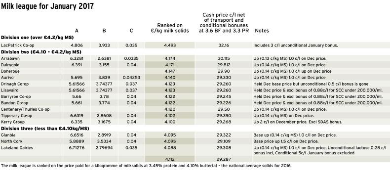 The inclusion of an unconditional January 3c/litre bonus pushes LacPatrick (formerly Town of Monaghan & Ballyrashane) to the top of the January milk league. The January milk statement arrived to most dairy farmers recently and for many it confirmed more good news, with January milk prices up on average by 0.14c/kg milk solids or 1c/l in old money for most co-ops.
