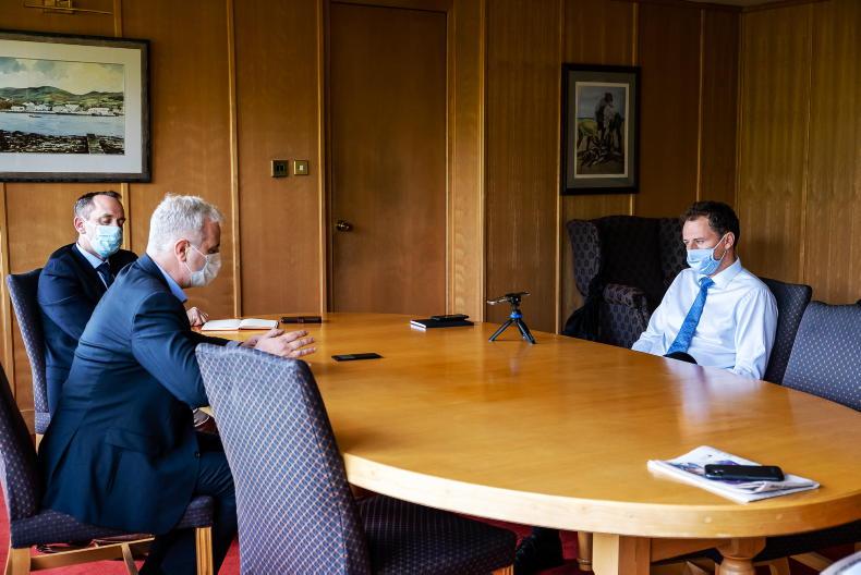 Minister for Agriculture Charlie McConalogue in conversation with Justin McCarthy and Pat O'Toole of the Irish Farmers Journal. \ Philip Doyle