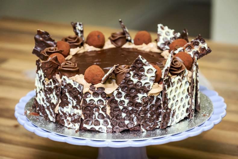 5 To use, pull the bubble wrap away from the chocolate, break the chocolate into shards and stick to the sides of the cake using the chocolate buttercream.