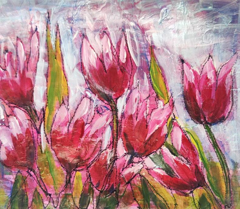 All Red, a mixed media piece inspired by tulips by Mary. The piece features stitch and paint.