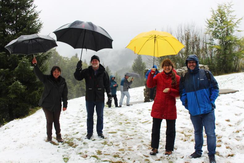 Jerneja Coderl, Slovenian Forest Service, Professors Janez Pirnat and Vera Zgoni, University of Ljubljana and study tour participant Fergus Mahon, Forest Service enjoy unseasonal snow in the Pahernik forest at 1,100m elevation. \ Donal Magner