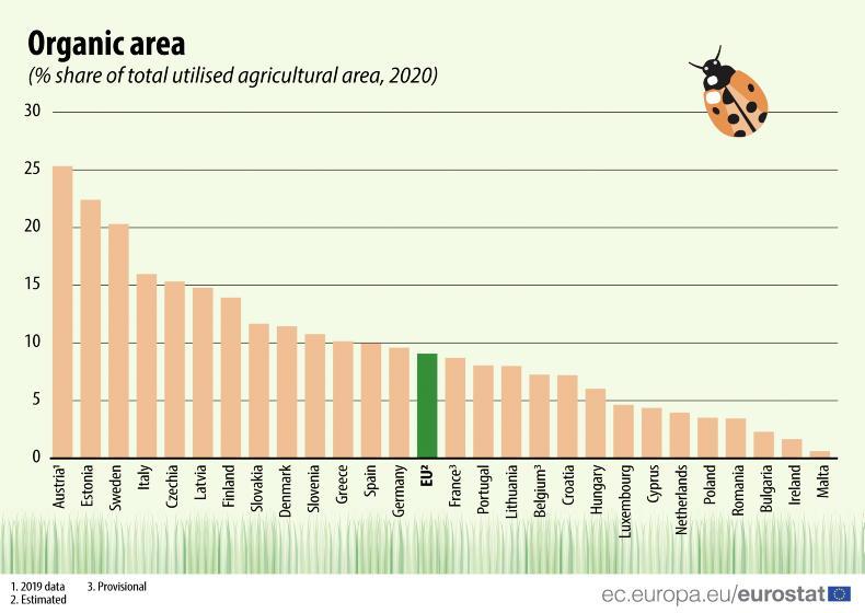 Organic farming has struggled for widespread traction in Ireland, with just 2% of farmland in organic farming compared with the EU average of 9%. Within this average, Ireland is at the lower end, but it increases to 25% in Austria and over 20% in Sweden and Estonia.