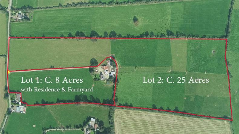 Lot 1 is eight acres with house and yard. The guide price is €220,000. Lot 2 is 25ac with a guide price of €275,000. The guide for the entire is €470,000 to €500,000.