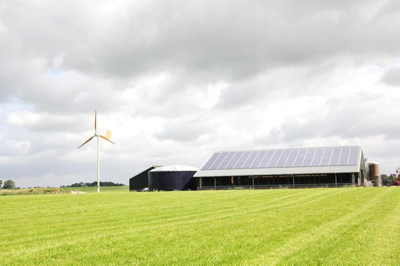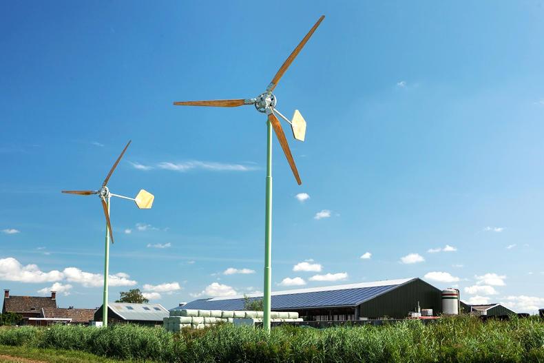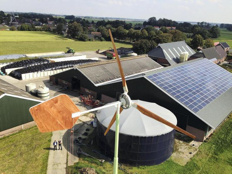 A small wind turbine and solar panels installed on a Dutch dairy farm.