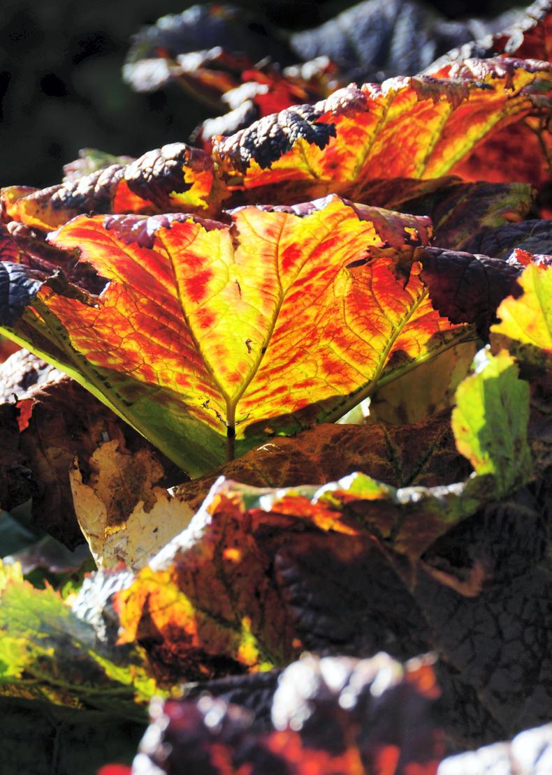 The autumn leaves of Sedum spectabile can be very beautiful, with soft shades of yellow and pink. Dicentra spectabilis, the tall kind for early summer, also shows soft yellow and pink as it melts away in summer, long before autumn colour arises. Rodgersia and darmera have large rounded leaves that colour well, especially Rodgersia podophylla ,which turns orange-red (shown). Eupatorium, or Joe Pye weed, is tall and its pink-purple flowers are followed by the leaves turning orange and yellow, making a good contrast.