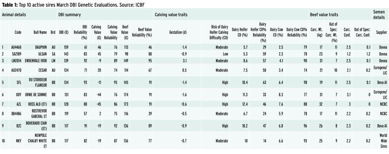 Table 1 lists the 10 top-ranked active sires from the March 2020 DBI genetic evaluations released by the ICBF last week.