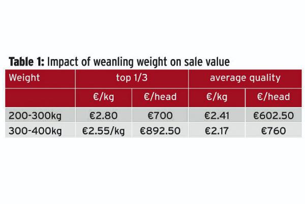 Farmers producing for this market need to focus on getting weight in their animals at weaning to cover production costs and return a margin. Selling light weanlings weighing from 200kg to 300kg, and from €500 to €600 per head, will, in many cases, fail to cover the cost of keeping the cow for the year. If targeting this market, select sires with good growth potential that will help deliver a heavier weaning liveweight.