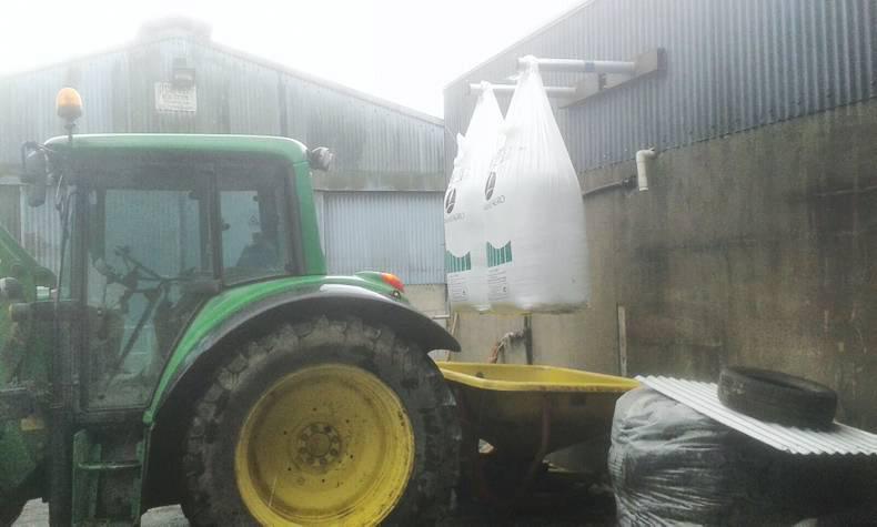When Jim has fertiliser to spread, he uses the front loader of the tractor to lift a bag on to the hook. He reverses the spreader underneath and cuts the bottom of the bag to release the contents.