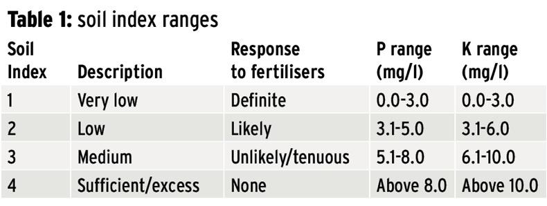 The index ranges are shown in Table 1 from 1 to 4. Soils in index 4 are considered very fertile, while soils in index 1 are considered poor. Grassland with good overall soil fertility has a pH of over 6.2 and is index 3 for phosphorus (P) and potassium (K).