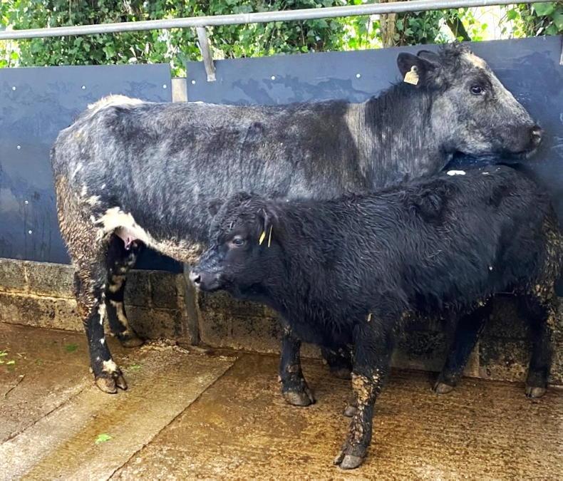 This 2022-born Belgian Blue-cross cow with her Limousin calf at foot sold for €3,200.