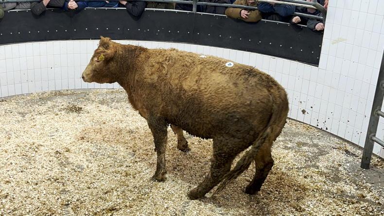 There was a great trade from start to finish, with dry cows meeting steady demand all day, with one Charolais-cross cow weighing 890kg selling for €2,680 (€3.01/kg) and one Limousin-cross cow weighing 655kg selling for €2,180 (€3.33/kg).