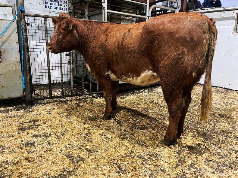 This Shorthorn-cross heifer born April 2022 and calving in January to a Charolais stock bull sold for €4,550.