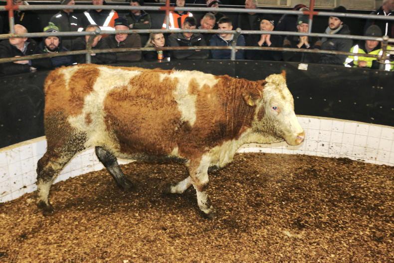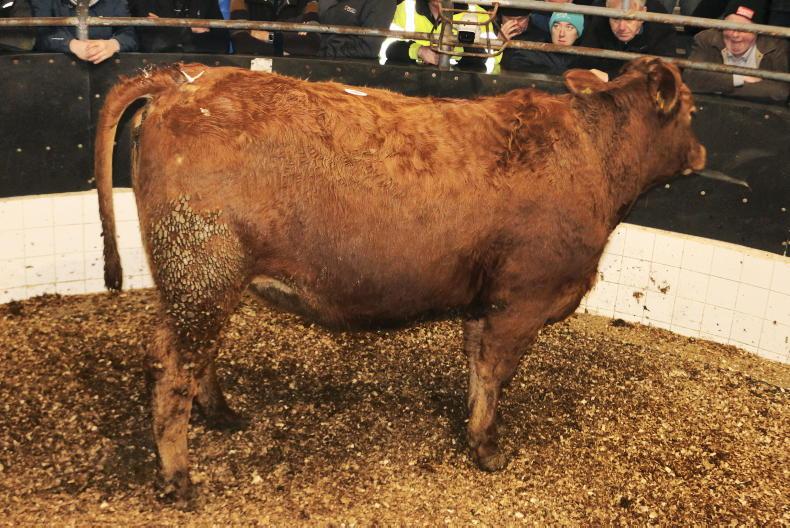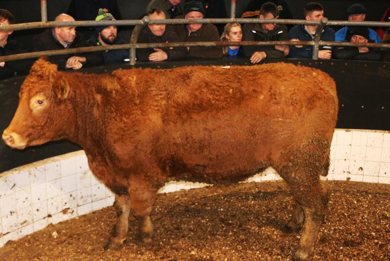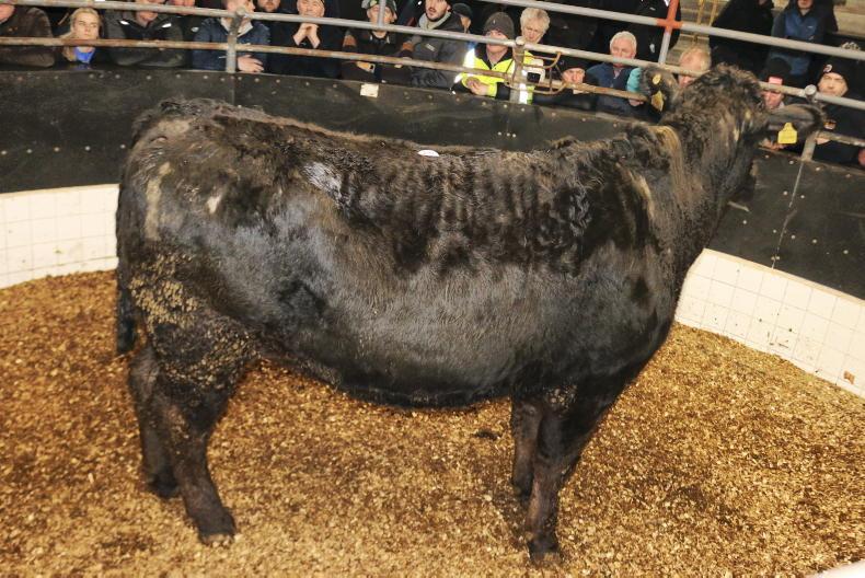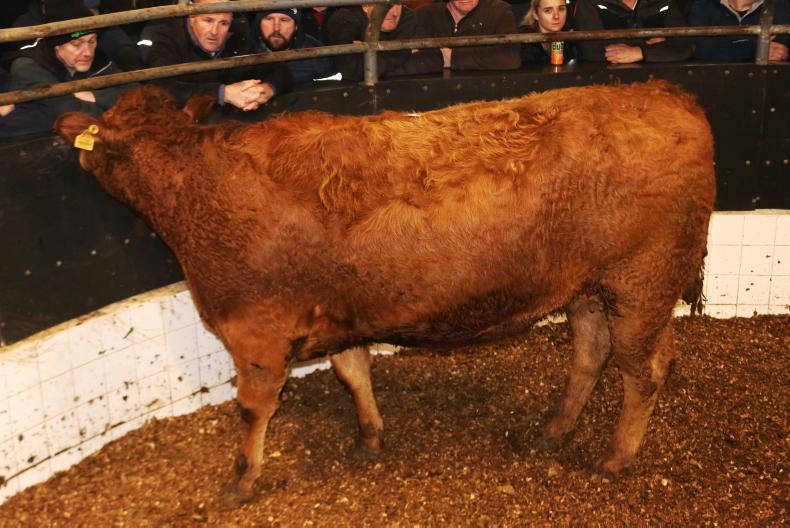 Top call on the night was a Limousin-cross heifer scanned eight-and-a-half-months in-calf. Born May 2023 and weighing 685kg, she realised €5,950 (€8.69/kg), being knocked down to a ringside buyer.