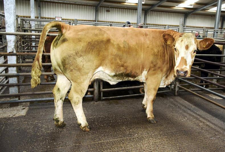 This Charolais cow, weighing 690kg and born March 2012, sold for €1,130 (€1.64/kg). \ Clive Wasson