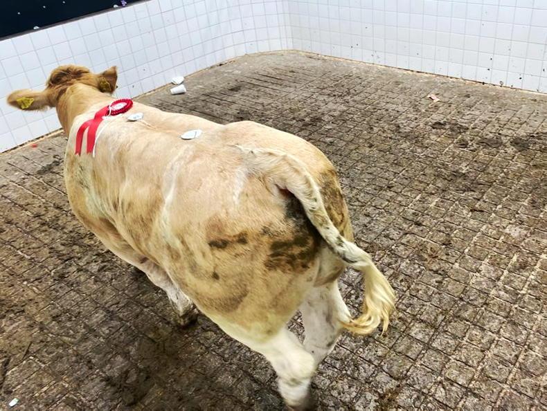 This Belgian Blue heifer born in January was champion of the show, weighed 315kg and sold for €2,700 (€8.57/kg).