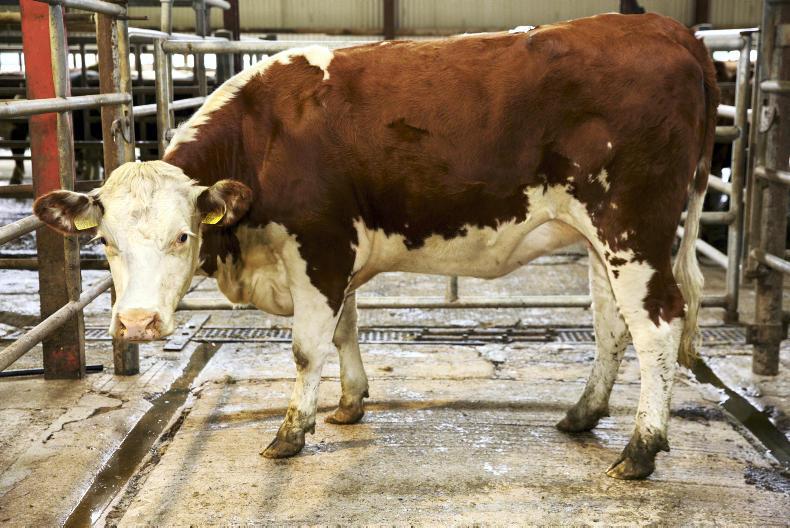 This Simmental-cross bull, born June 2019, weighing 439kg, sold for €790 (€1.79/kg).