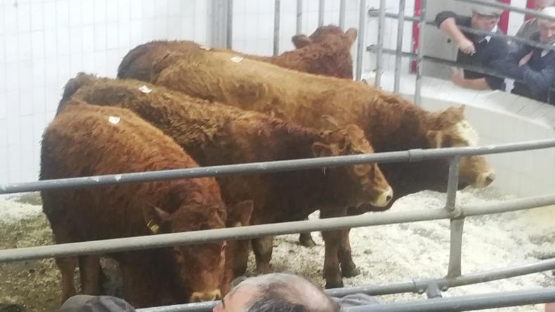 One Belgian Blue heifer 355kg − €970, €2.73/kgThree Charolais heifers 280kg − €765, €2.73/kgThree Belgian Blue heifers 321kg − €790, €2.46/kgOne Limousin heifer 320kg − €840, €2.63/kgThree Charolais heifers 328kg − €775, €2.36/kg