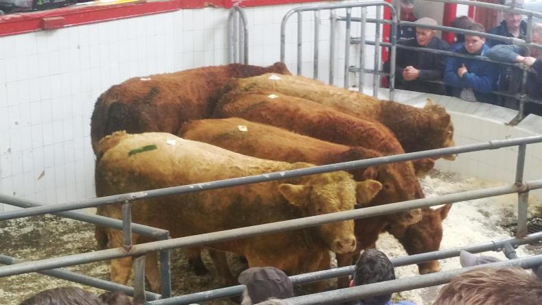 One Charolais bull 475kg − €1,170, €2.46/kgOne Charolais bull 340kg − €990, €2.91/kgTwo Limousin bulls 275kg − €790, €2.87/kgThree Limousin bulls 271kg − €865, €3.19/kgOne Charolais bull 310kg − €820, €2.65/kgWeanling heifers sample prices