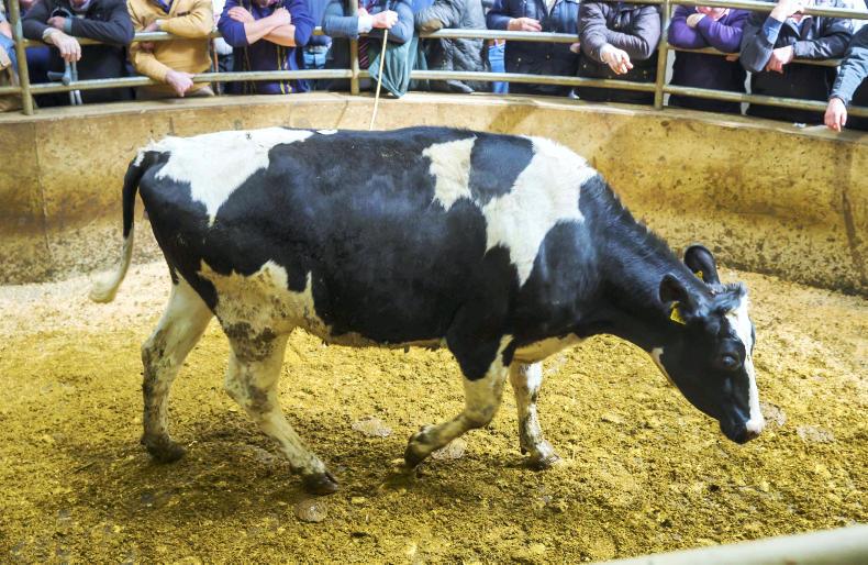 Fleshed Friesian cows sold mainly from €300 to €500 along with the weight, while continentals made from €400 to €600, with the tops selling to €800 over the weight or €1,700 for a top-quality 900kg cow (€1.89/kg).