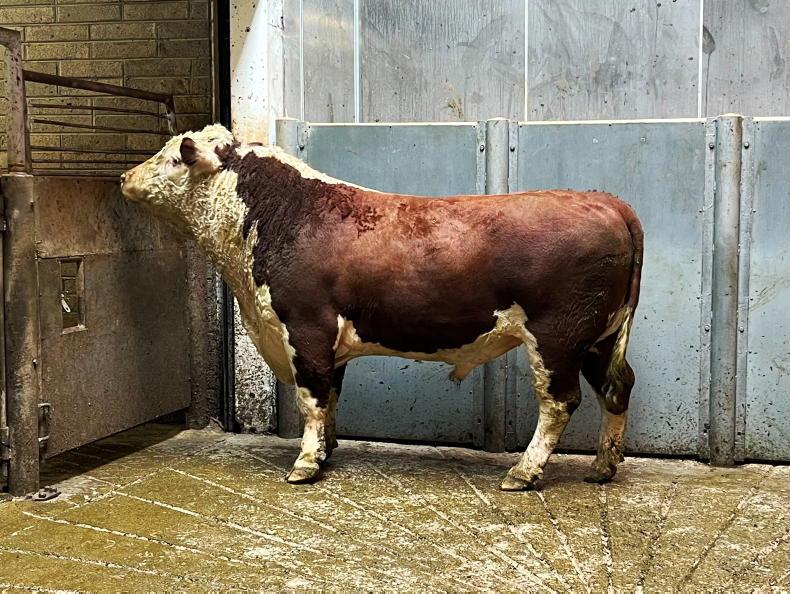 This Hereford bull born in July 2017 and weighing 1,050kg sold for €1,820 (€1.73/kg).
